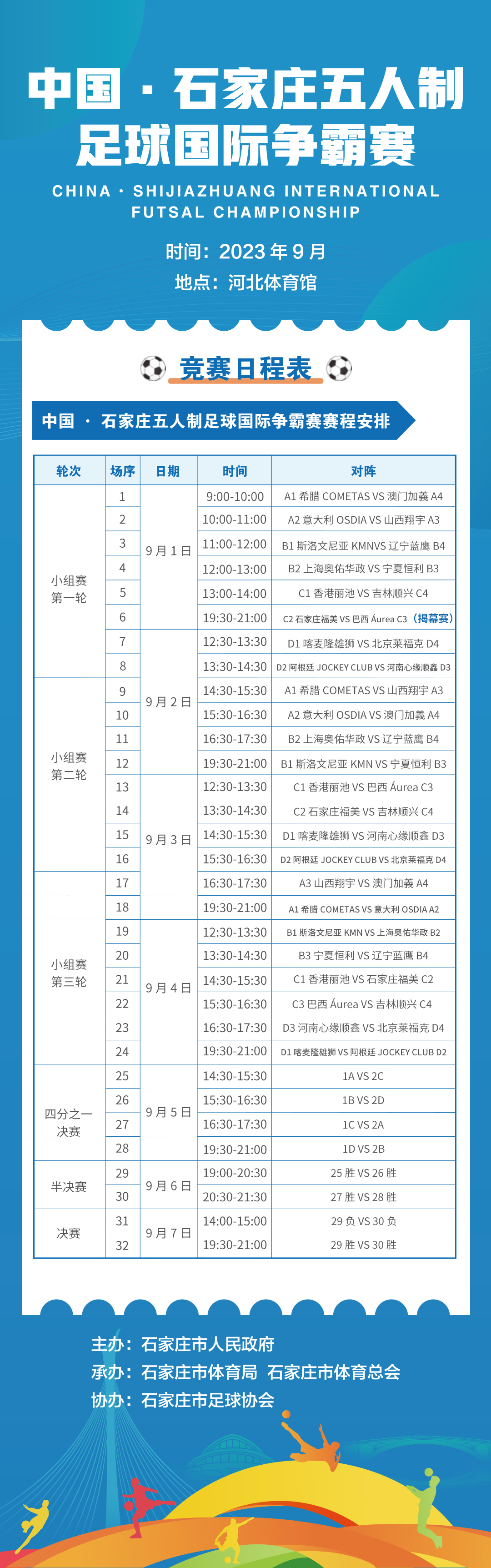 赛程7天,共进行6轮32场比赛,每场较量都扣人心弦、激情四射。火热赛事间隙,多项兼具娱乐性和互动性的现场活动穿插其中,摇滚乐队、足球宝贝、文体展演嗨翻全场、燃爆省会。9月1日19:30的揭幕大战,将由石家庄福美足球队对阵巴西里约热内卢Áurea足球队,知名足球评论员刘建宏担任揭幕赛现场解说。